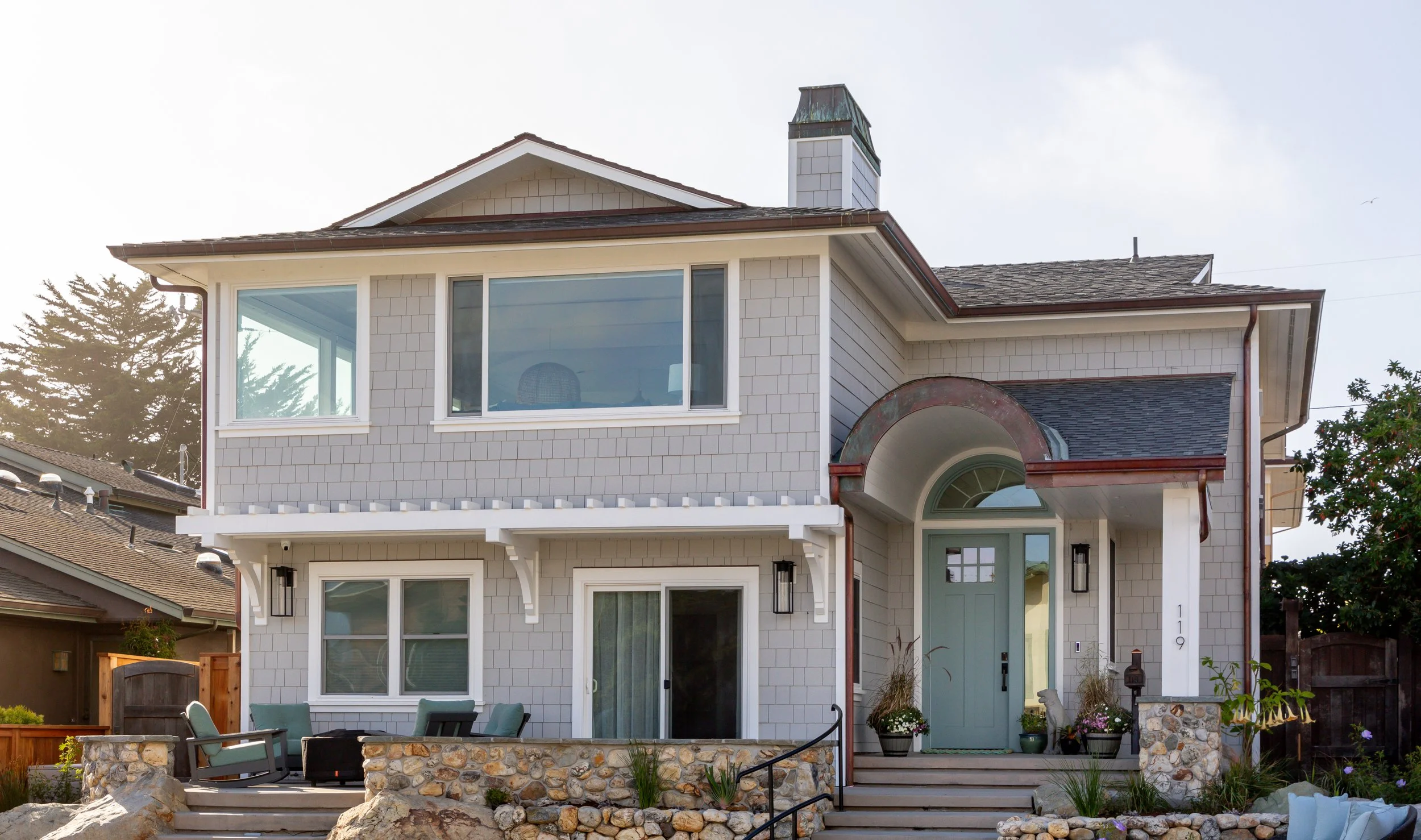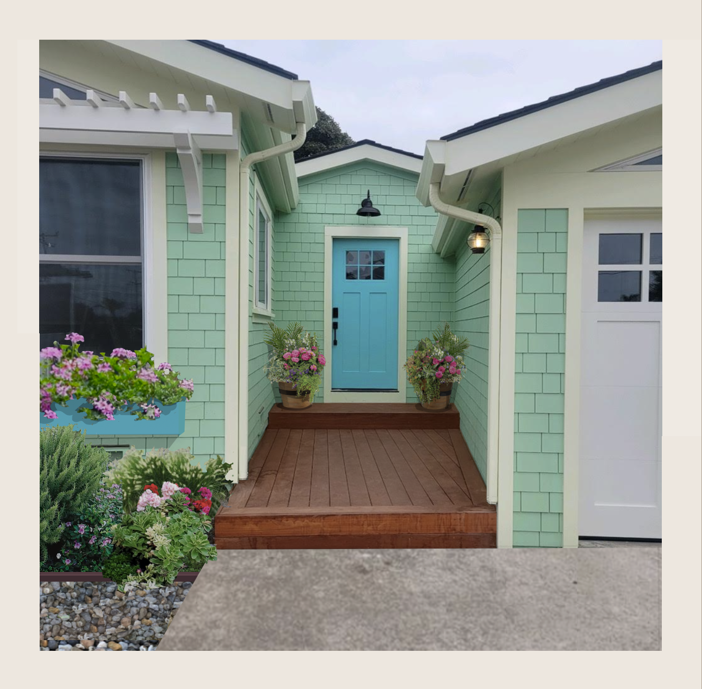 The owners of this cottage home spend time every year in their beloved Key West Florida. When they decided to buy a retirement home in Aptos, California, they wanted to create a beautiful Key West vibe with its vivid colors. As we chose colors, they particularly loved this vibrant green paint with the light yellow trim. When it came time for the door however, they were concerned that perhaps they had gone overboard and should dull down the door. I encouraged them, “ When you go big, you need to take it all the way!” We selected this color for the door and modified the picture by adding flowers, landscaping, and a window box to match the door. By fully embracing their theme, they made it the cutest house in the neighborhood, and even won the Seacliff Beautification Award of the year!