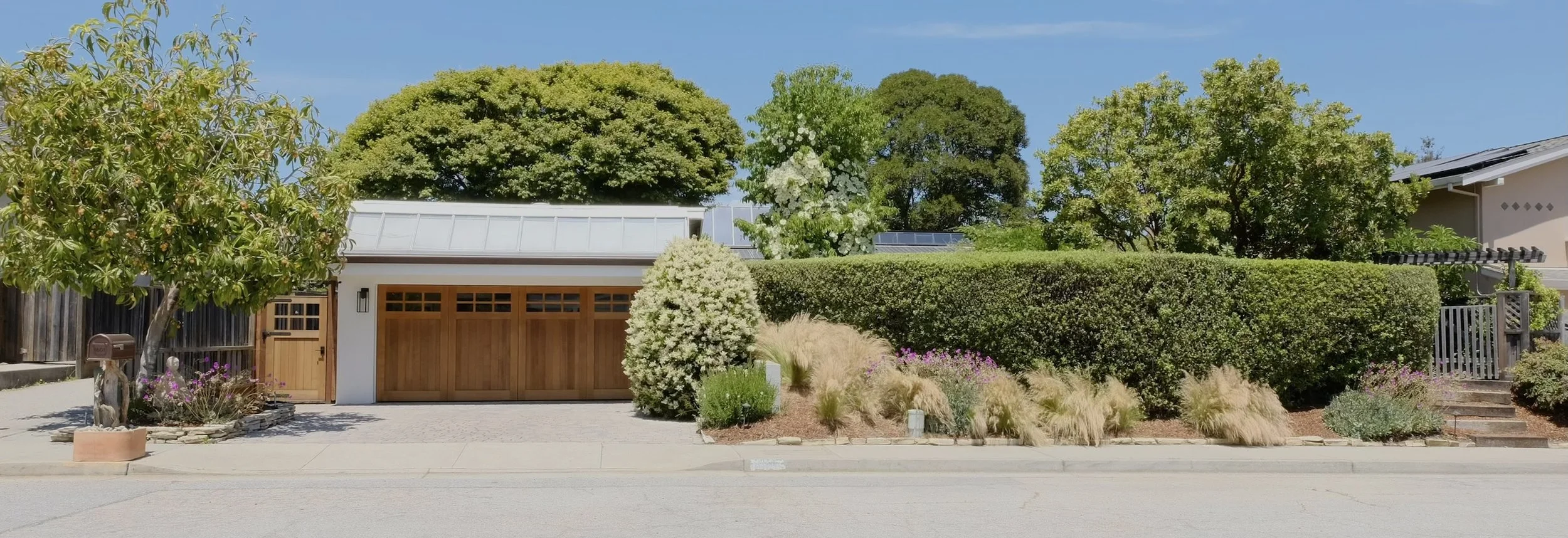 This Soquel home was a built in the late 1970’s. To update the look, I chose this bifold garage door and designed a matching gate to the left. The driveway was laid with Belgian stone to get rid of the cracks in the previous concrete. I wove in some grasses and succulents, and created a second entry to the right fashioned with railroad tie steps. These lead to an inviting entry with a trellis that opens onto a lush garden path.