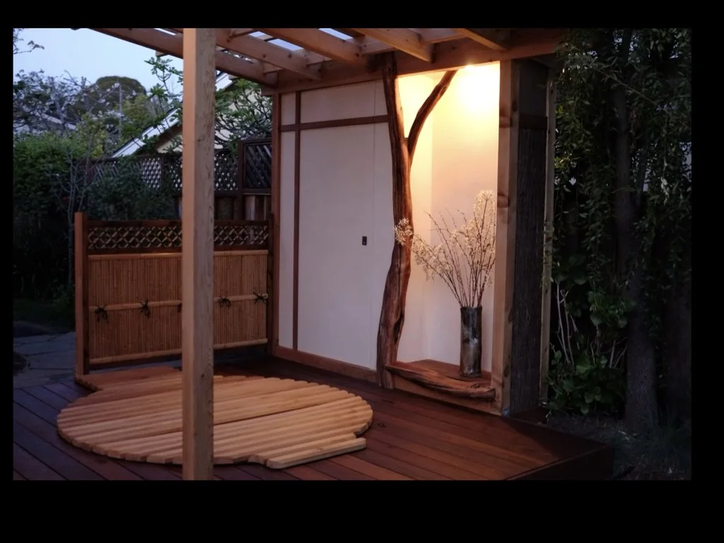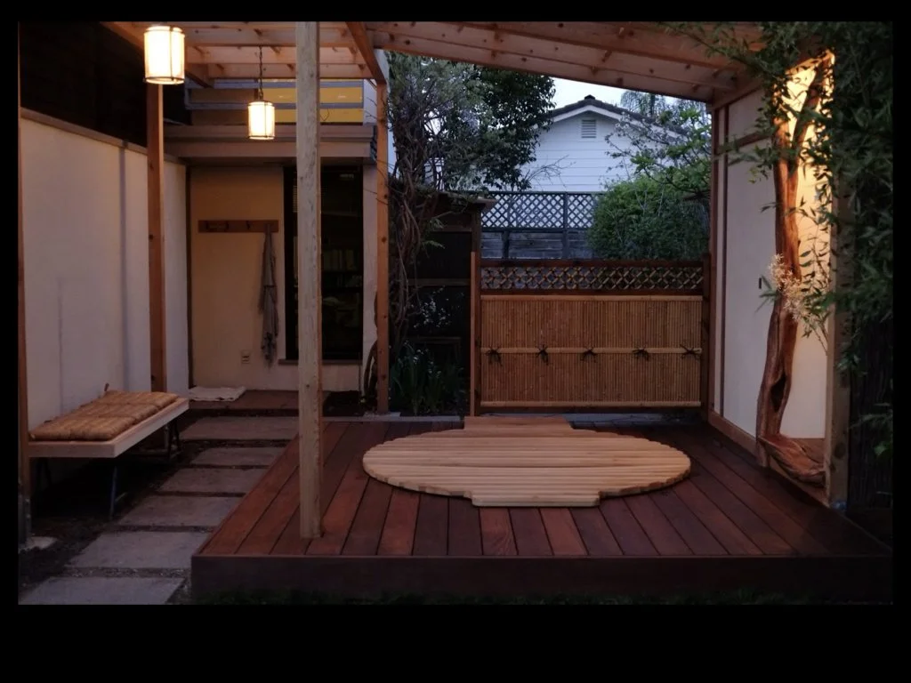 On the side wall of the hot tub is a hidden closet that holds tatami mats and a custom aluminum frame that can be inserted over the hot tub lid. When the hot tub is not in use, the tatami are laid out in a rectangle pattern. The region where the flowers are located is called a tokonoma: an alcove for a Japanese scroll and flowers. In some Japanese homes and temples, one side of the tokonoma is supported by a rustic tree that contributes to the wabi-sabi aesthetic. When the seasons call, the owner transforms this space into a tea ceremony hut.